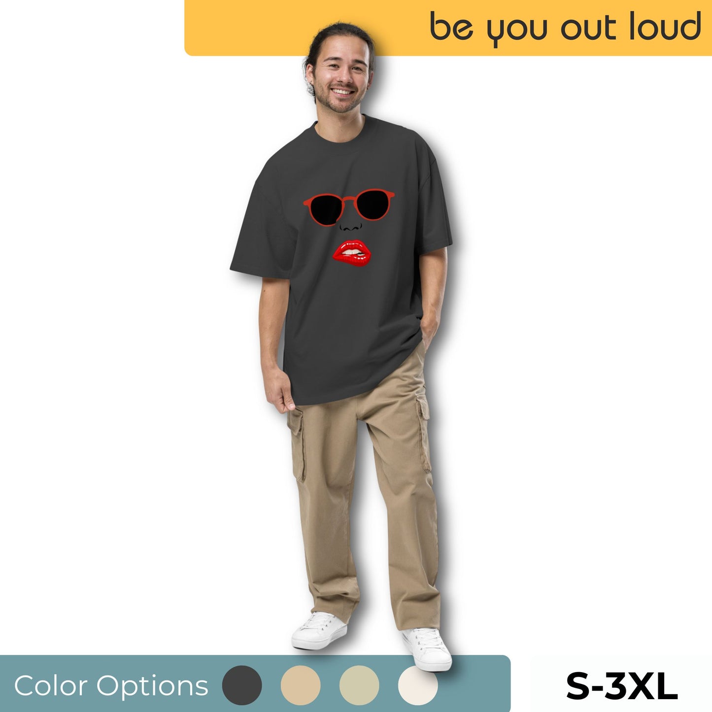 Make a statement with this Men's Oversized Graphic Tee featuring bold pop art lips and retro sunglasses. It's a playful choice for those who wear their heart on their tee and a perfect gift to spread love in style. Join the Be You Out Loud family, where self-expression is the trend.