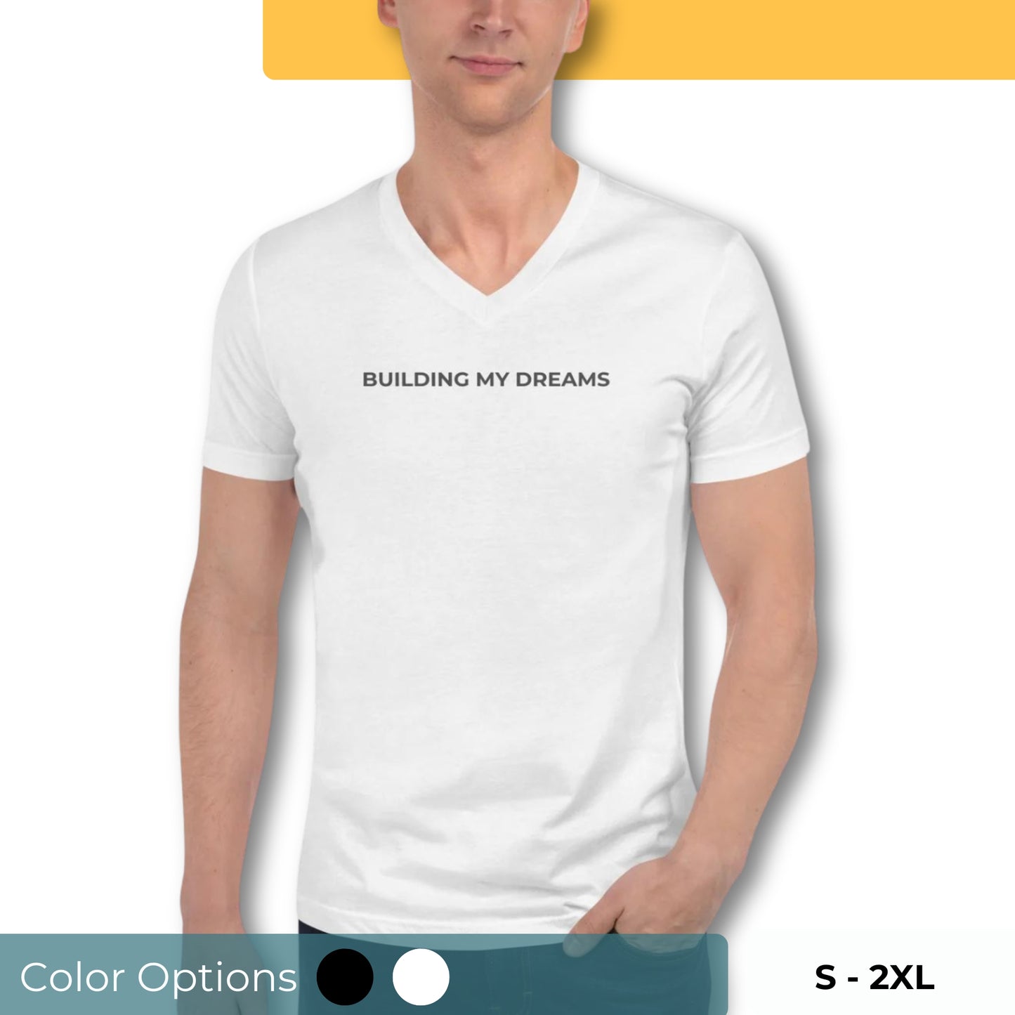 Chase your dreams with the "Building My Dreams" men’s v-neck tee from BYOL. Ideal for the ambitious, this tee combines comfort with motivation. Available in black and white, and sizes from S to 2XL.
